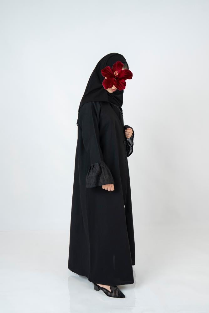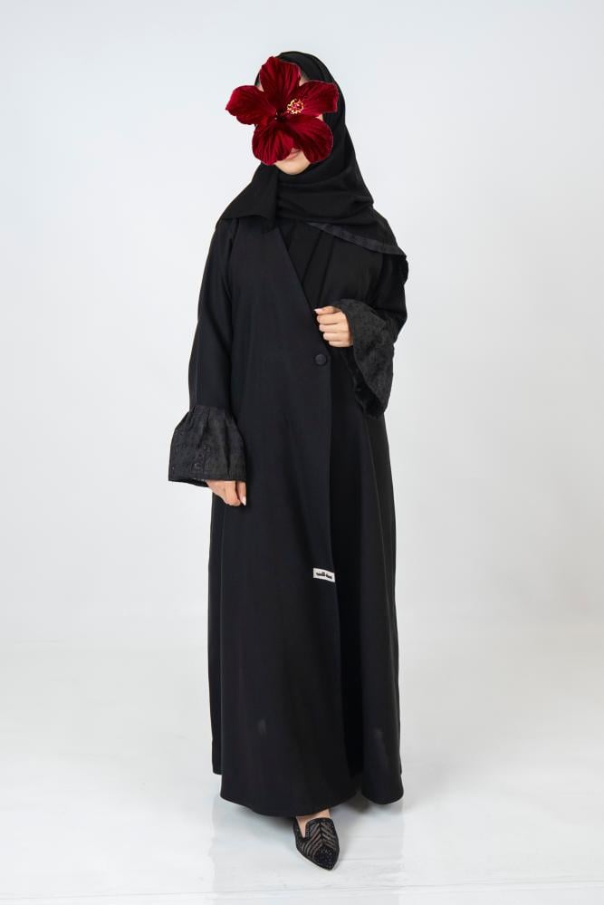 عبايه كتان باكمام قماش مخرملون الطرحه اسود بطرف قماش مخرم طويلقصه العباية ربع كلوشننصح بالغسيل الجاف في المغاسل المختصه